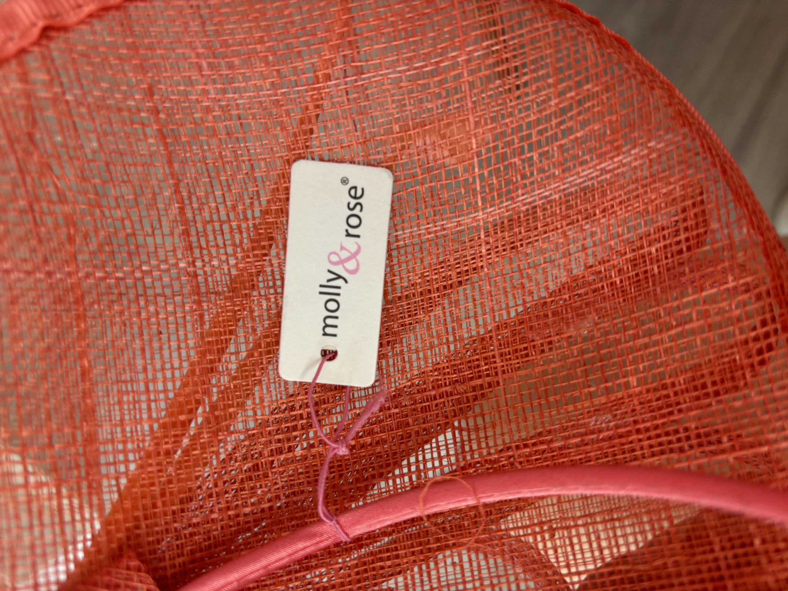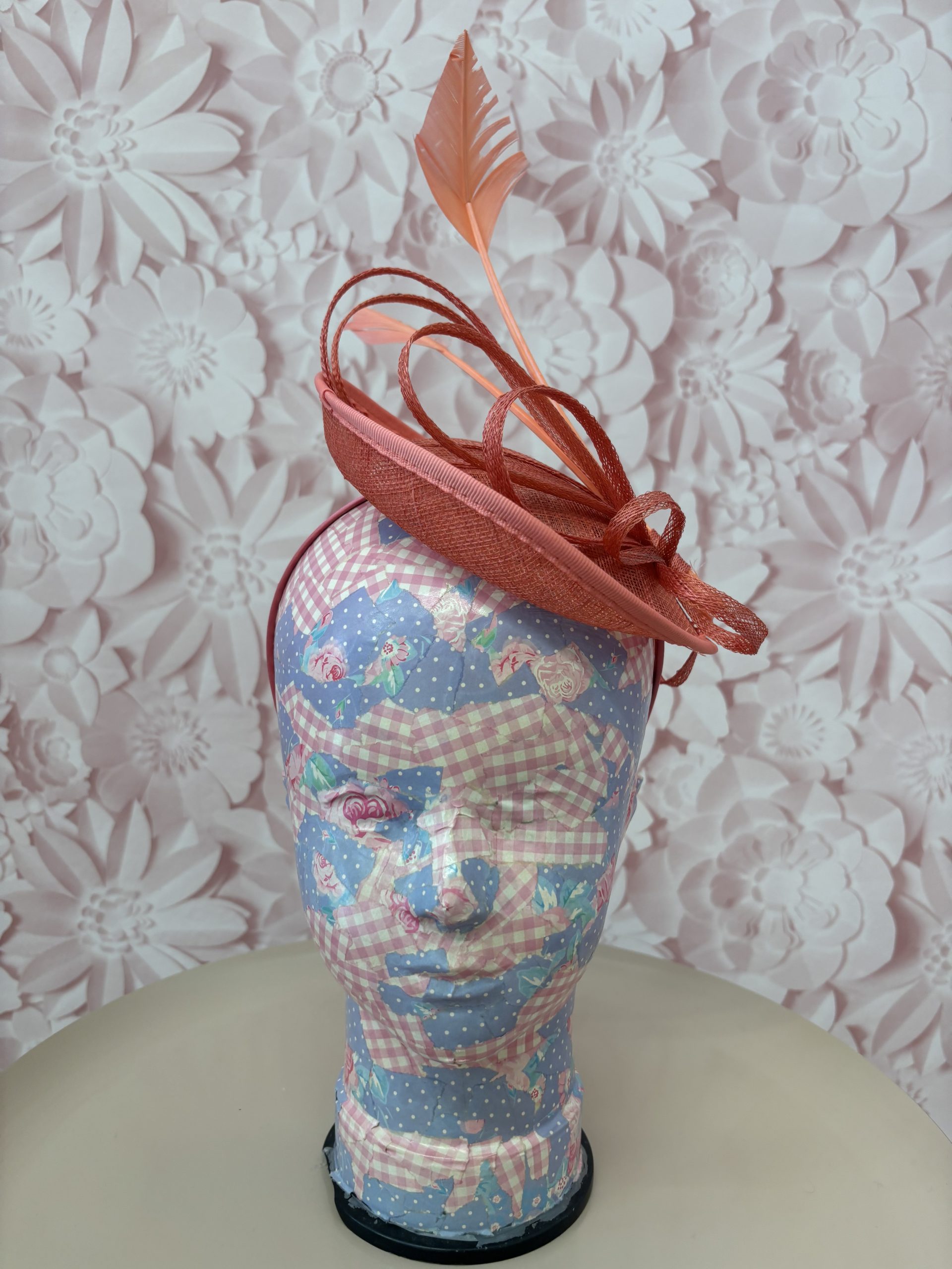 Elegant and sophisticated, this coral fascinator features a structured round sinamay base with delicate looped detailing and striking feather accents for a refined, modern finish. The sculpted design creates beautiful height and movement, making it an ideal choice for weddings and special occasions.